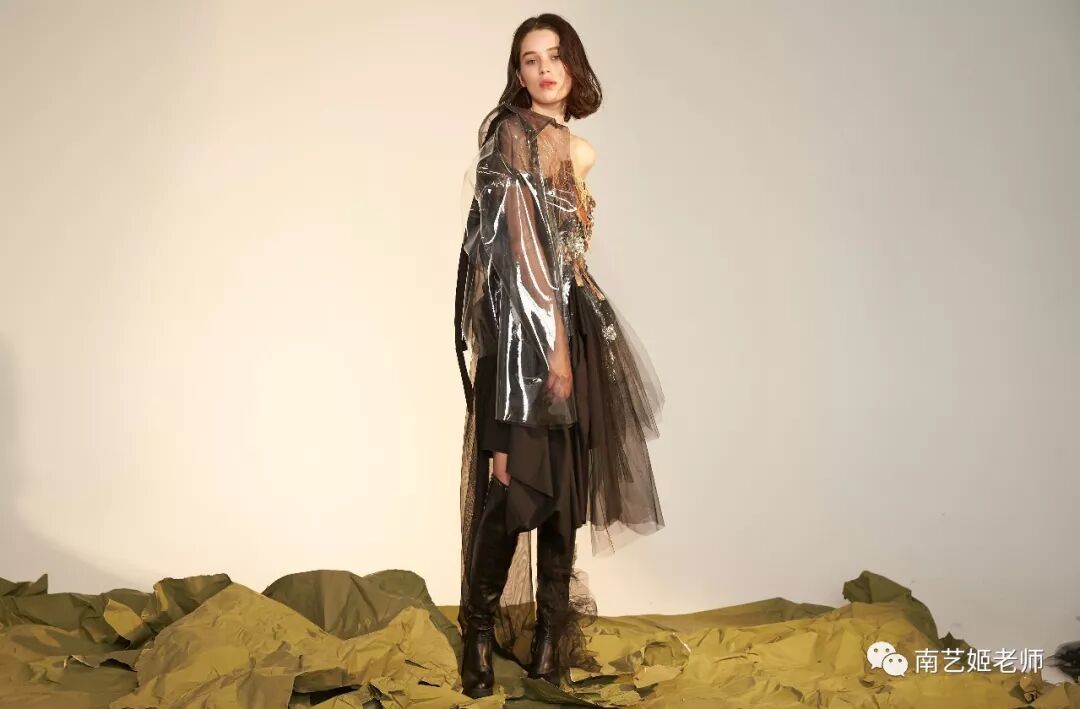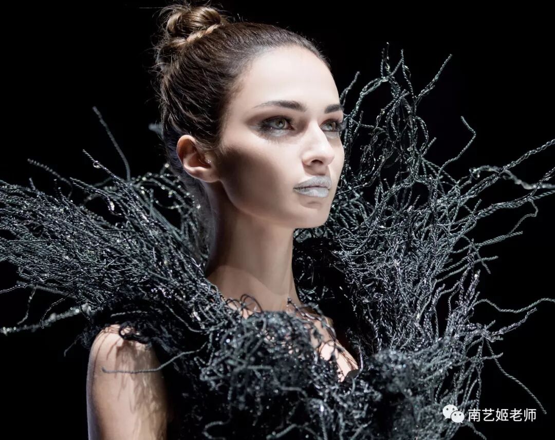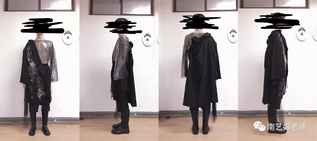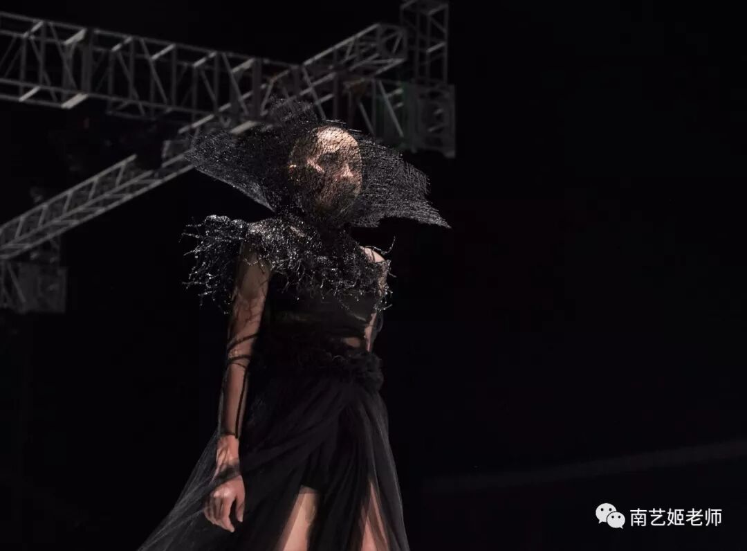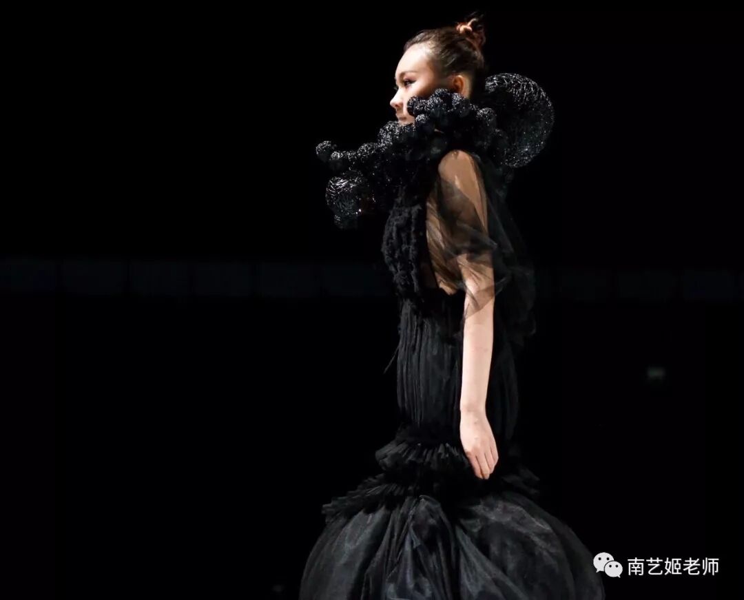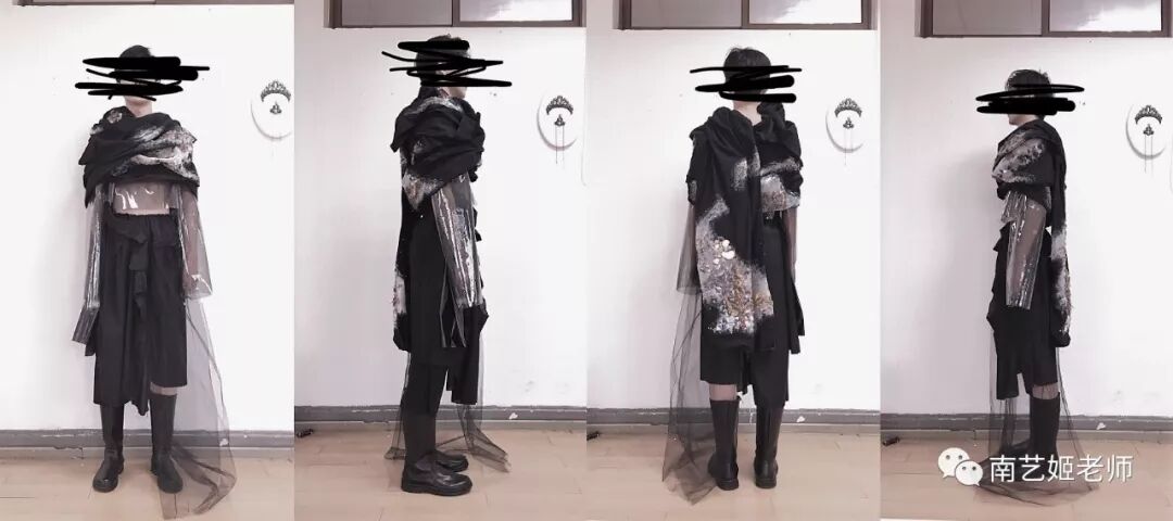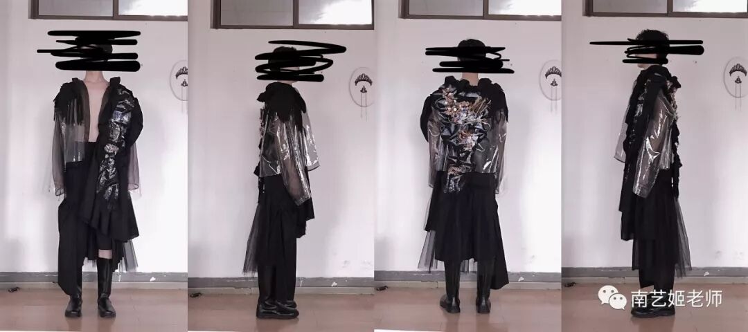 除了现实生中很爱黑色的原因除外,作品用了用全黑色的目的,是希望更多的关注点是到作品本身上去。材料的运用,装置的形态,包括最后服装表现的形式,除去颜色,更能直观的去感受到实验性服装带给我们的启发性。