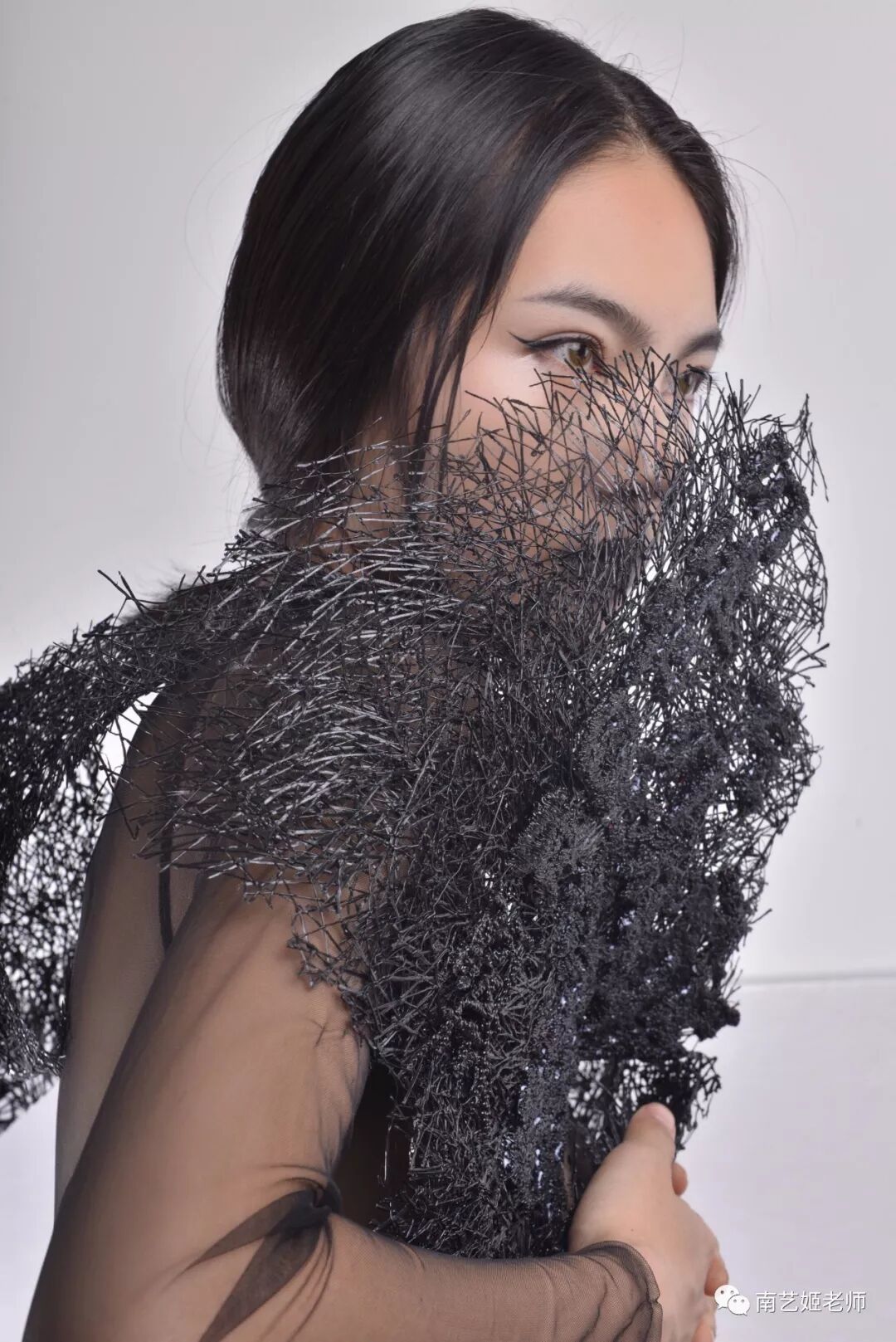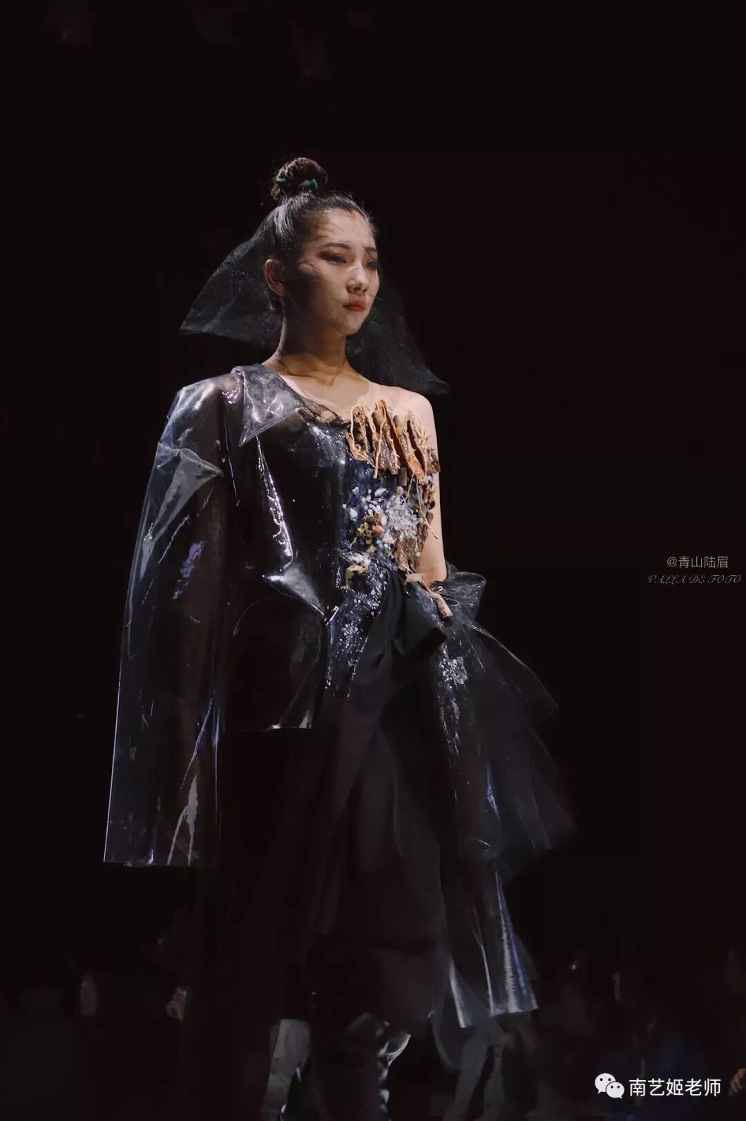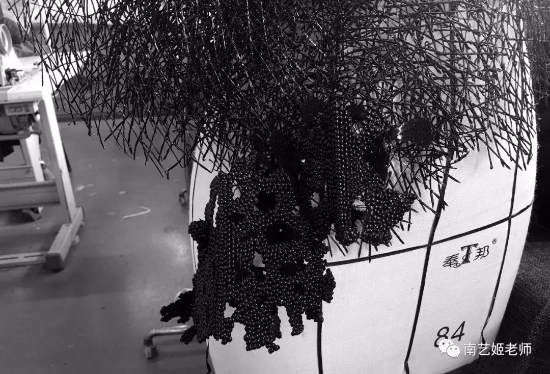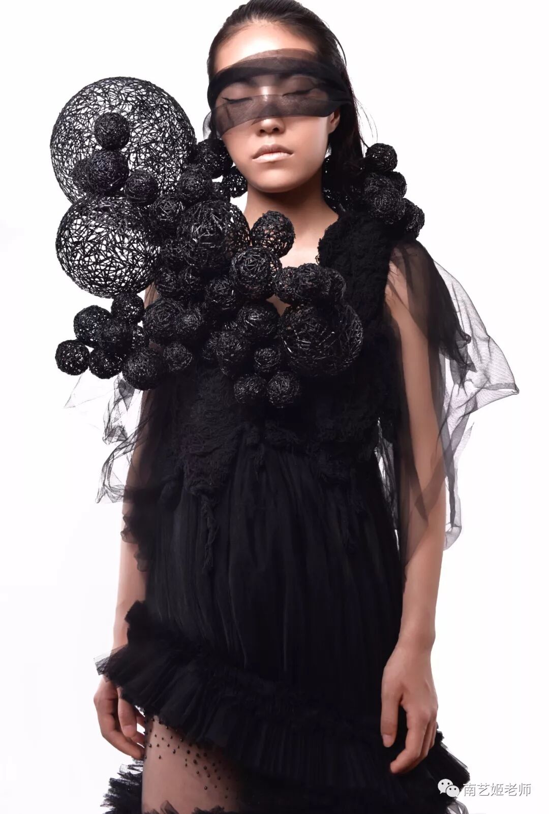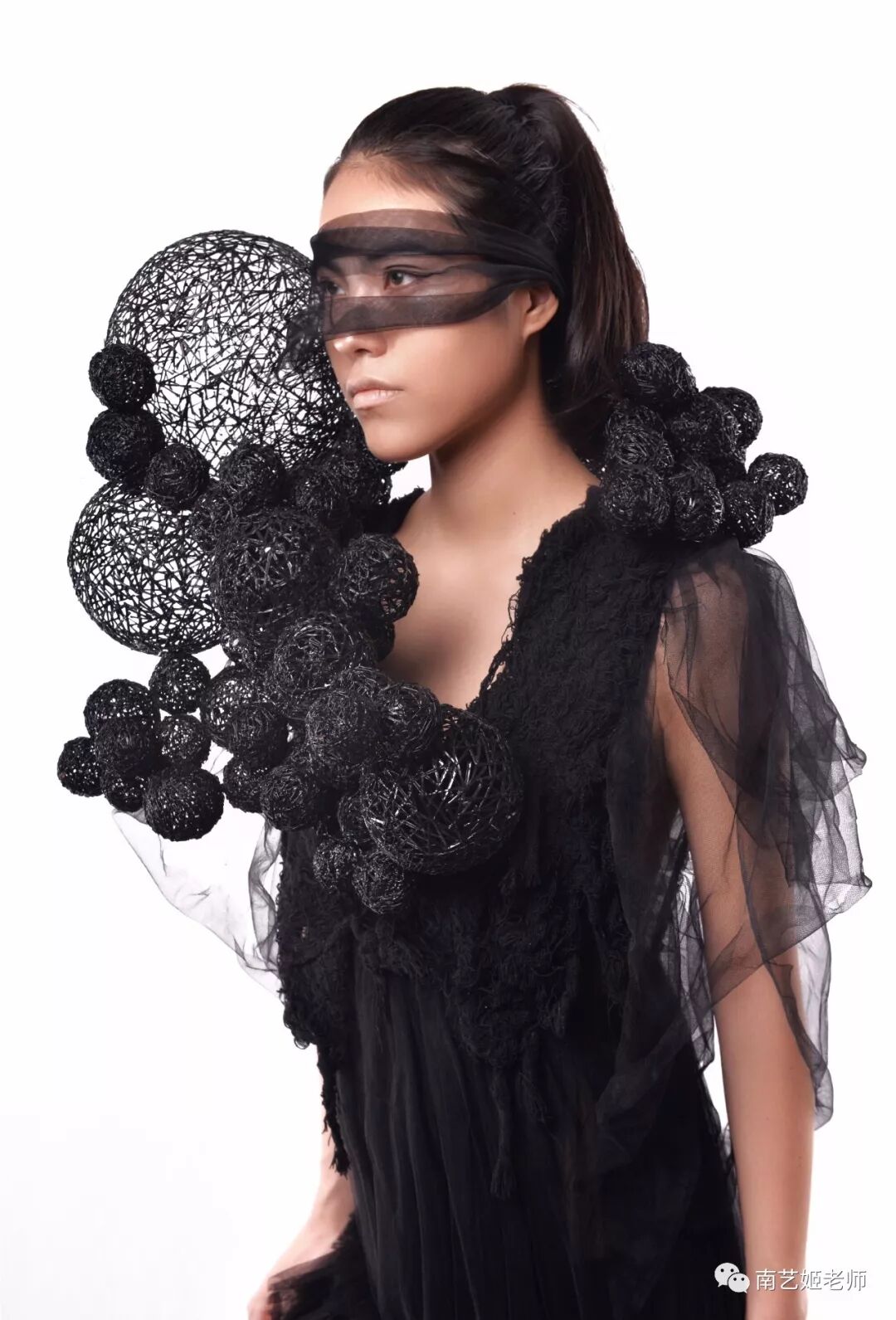 除了现实生中很爱黑色的原因除外,作品用了用全黑色的目的,是希望更多的关注点是到作品本身上去。材料的运用,装置的形态,包括最后服装表现的形式,除去颜色,更能直观的去感受到实验性服装带给我们的启发性。