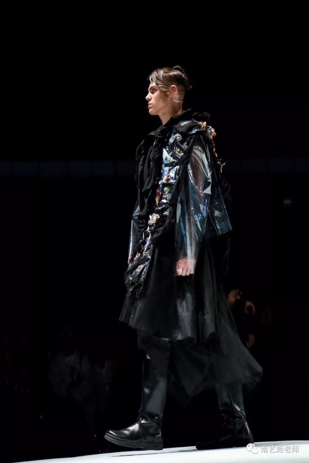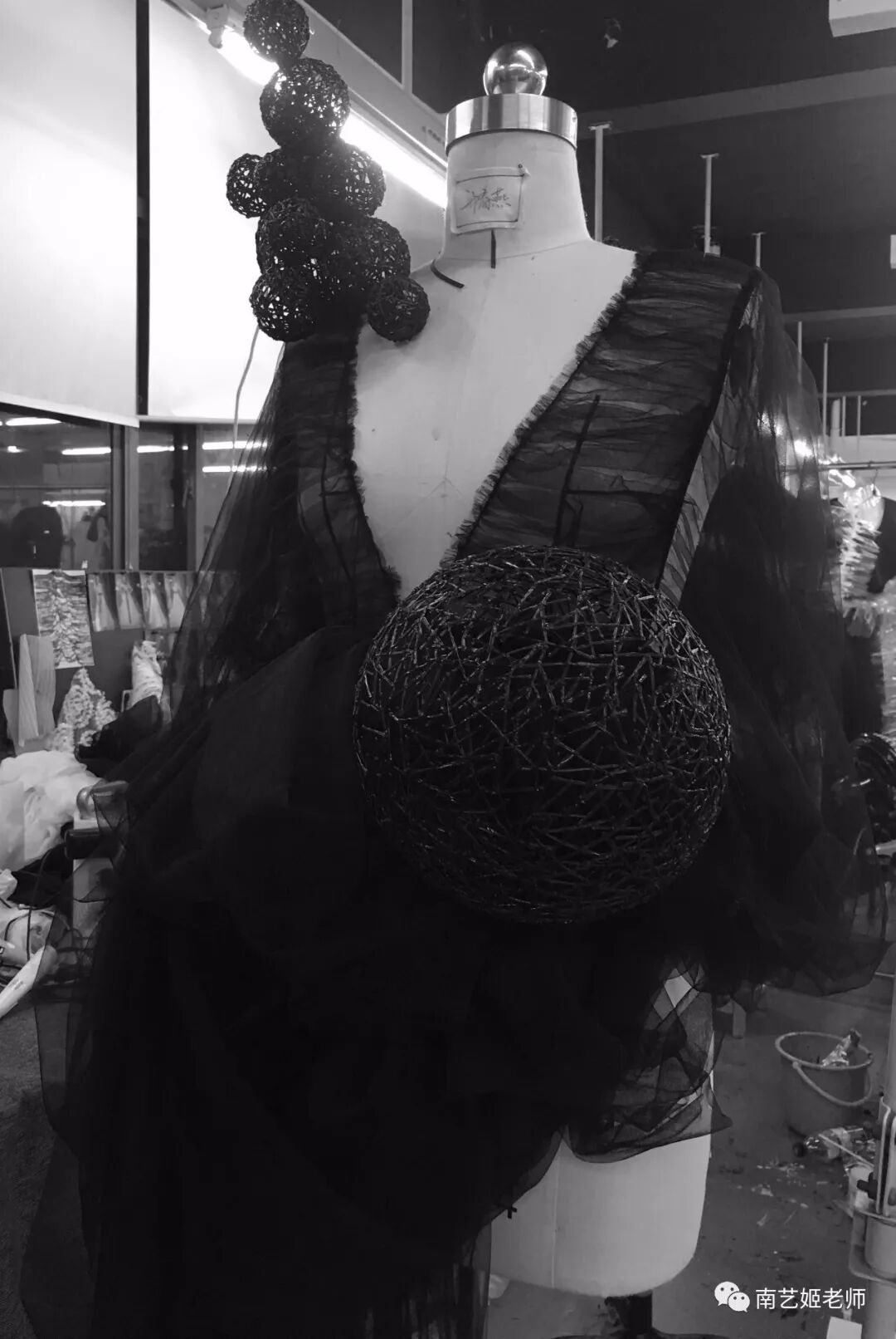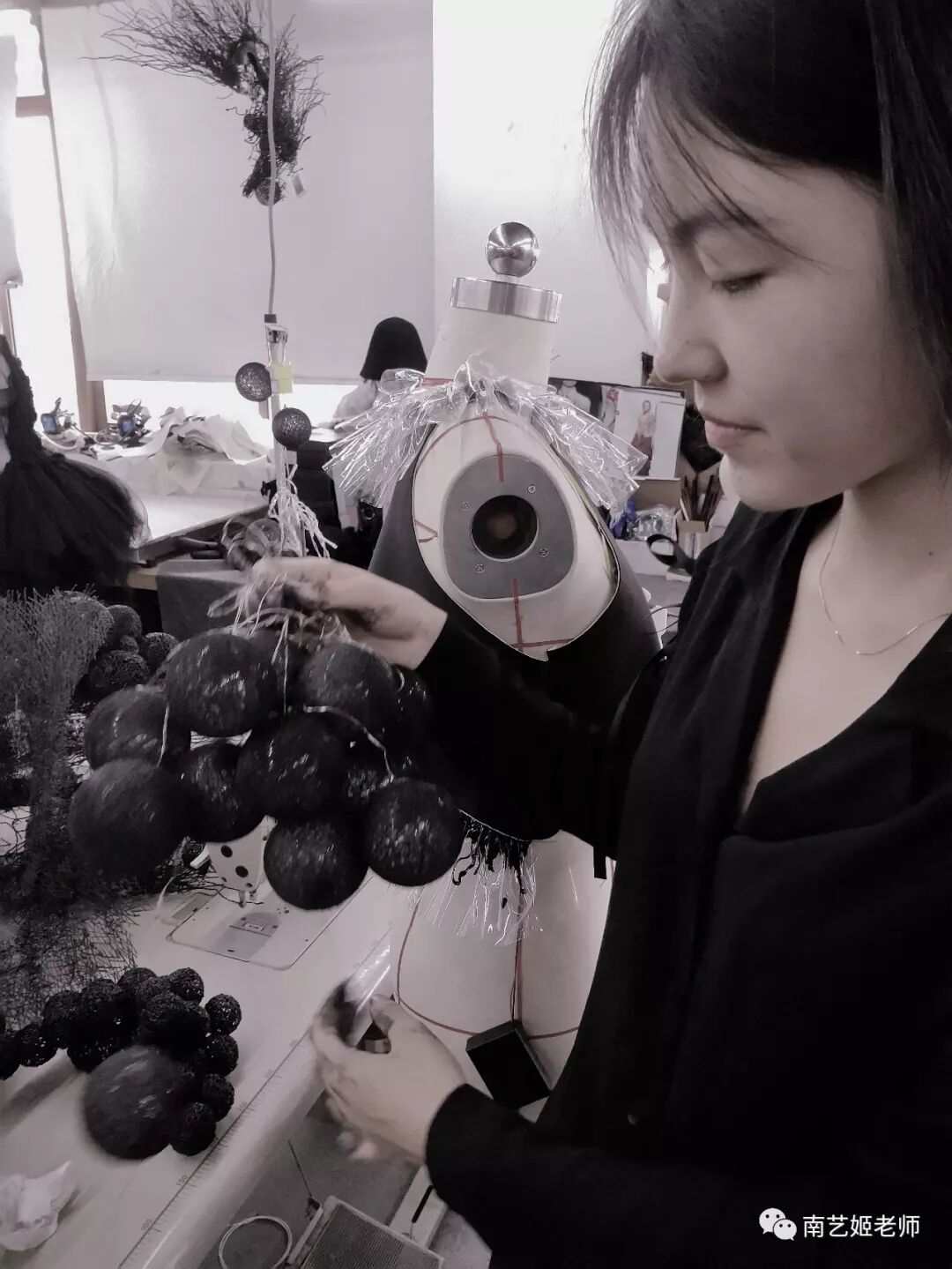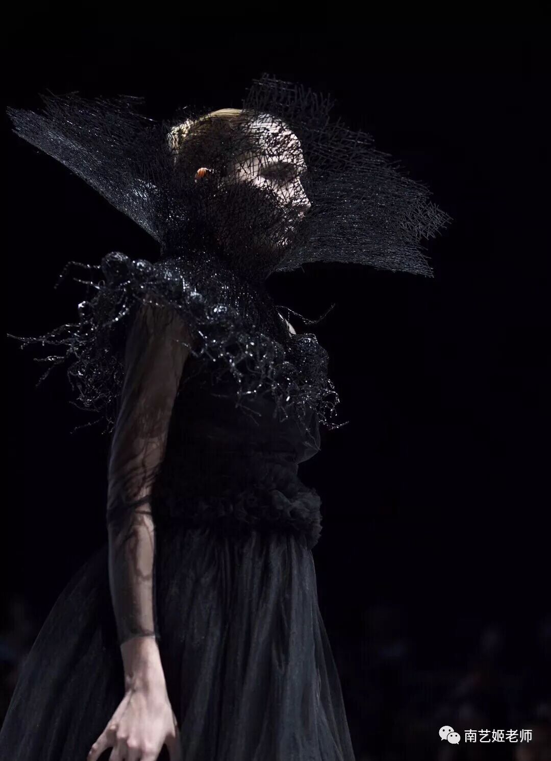 除了现实生中很爱黑色的原因除外,作品用了用全黑色的目的,是希望更多的关注点是到作品本身上去。材料的运用,装置的形态,包括最后服装表现的形式,除去颜色,更能直观的去感受到实验性服装带给我们的启发性。