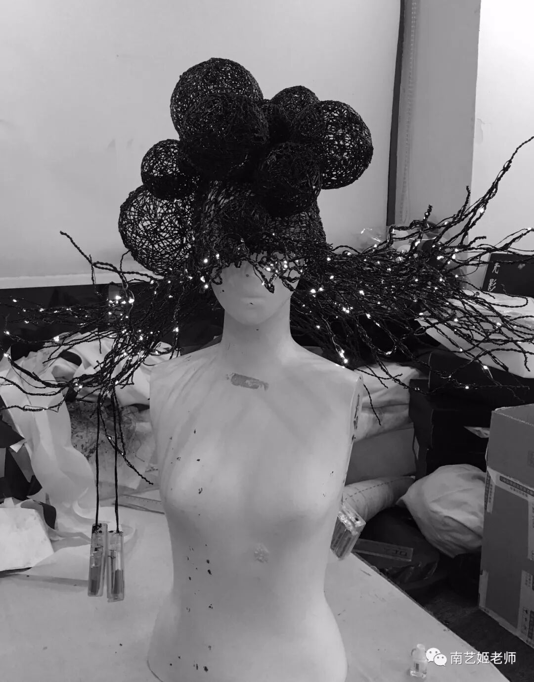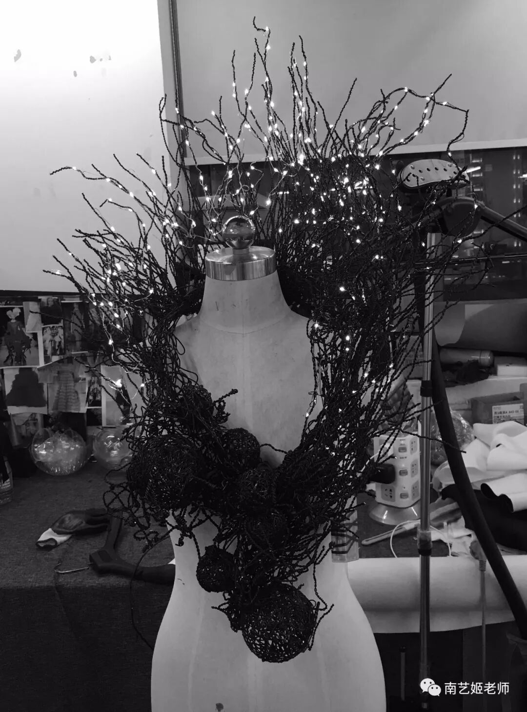 后期运用铝丝线和LED灯与3D装置结合,探索服装表现的更多可能性。