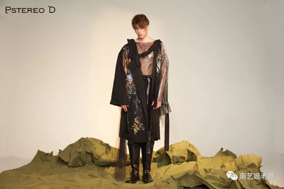 对于服装的结构,采用的是面料堆砌手法,例如做了几条百褶裙,将它缝在外套上作下摆,制完几件衬衫,将它挂在裙裤上作层次,系好几条领带,将它放在衣服上作飘带。