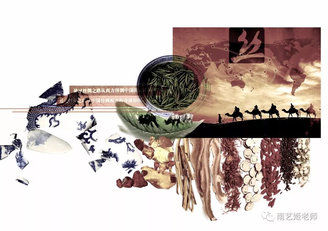 在“一带一路”这个大主题下,先从丝绸之路入手,回顾丝绸之路,提取丝路符号,思考如何将两千年前的丝路古道以现代服装设计的方式体现。通过大量的资料翻阅与信息搜集,决定把设计点定位在丝路贸易的商品物件上。因此我选择了具有代表性的东方的瓷器、茶叶,西方的琥珀、香料。同时,也研究了硅胶材料的应用,尝试打破不同领域间的界限,以对不同材料的探索去实现硅胶与面料的结合,拓展服装设计的更多可能性。