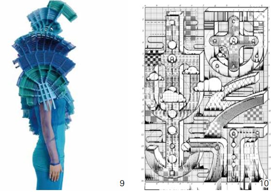 第三组课题,即现在推行的“主题性 - 综合型”模式。做法是将整个设计基础教学划分成四个单元,即设计基础 I、II、III、IV,每个单元 7至 8 周。每个单元以一个“主题”进行切入,以“综合”表现展开。所谓主题可以是某些具体的物象,如自行车、芭蕉树、纸、人等,或是抽象的哲学名词、一句诗、一段音乐等,或是一种手法如拼贴、解构等。围绕主题完成大约 10 个作业,包括 3 种要求 :第一是多元形式语法,以不同标准和规则设计作业 ;第二是多种形态表达,从超写实、具象表现,到意向、抽象、装饰,再到超现实;第三是多种表现媒介,如线条、立体、空间、材料、装置、影像、计算机等。四个单元的性质也有差别,有普适性的,有个性化的,有与未来专业方向结合的。在一年级下学期的第 3、第 4 单元中,逐渐向专业设计教学过渡。当然这种过渡并不是表面内容与技术性的衔接,而是另一种较高层次的学理认知与形式思维训练。如视传专业的教学课题是展开了一系列的关于“看的方式—视觉体验”的训练 ;服装专业的作业设计是指向以“身体”作为概念与可能的表现 ;环境设计专业是进入了一种“戏剧性的空间”生成的练习 ;手工艺专业则要完成“材质与媒介转换”“器物—原型与类型”“图的谱系”等方面的作业。