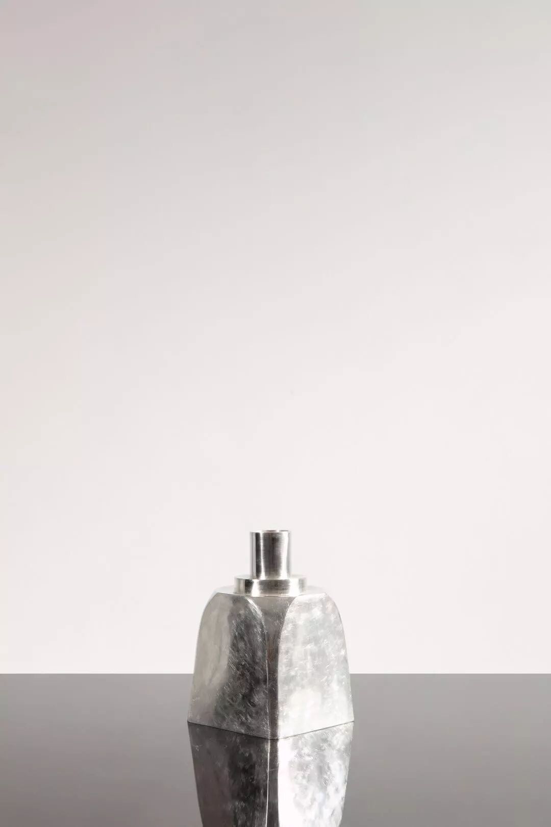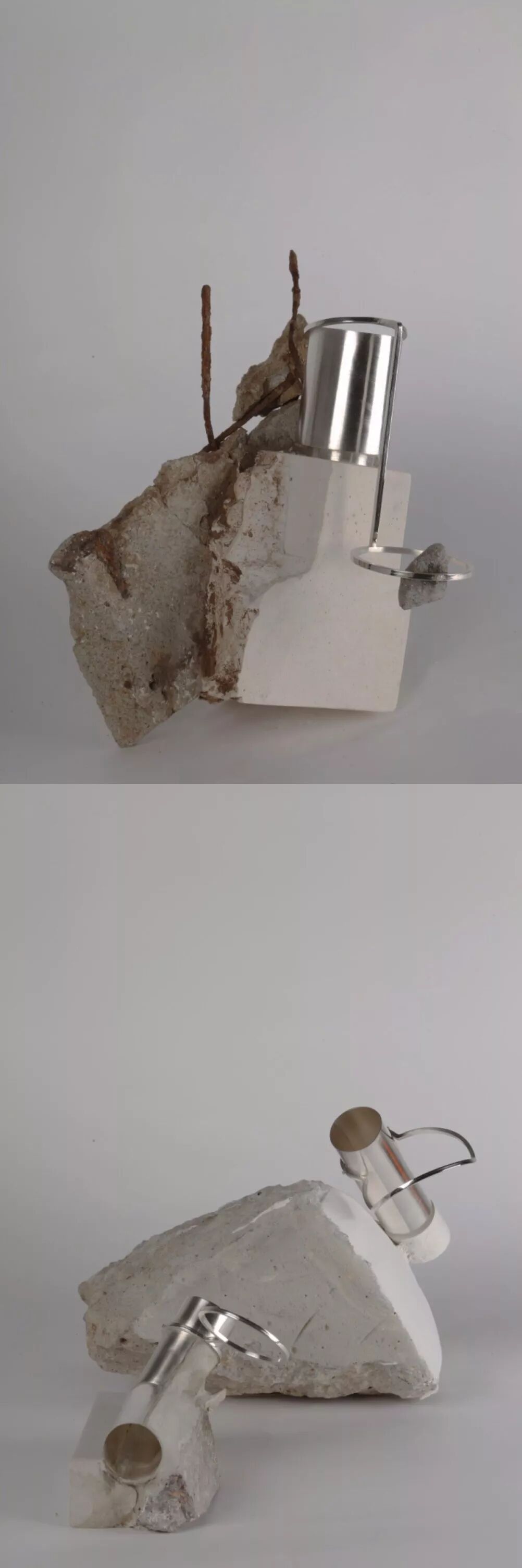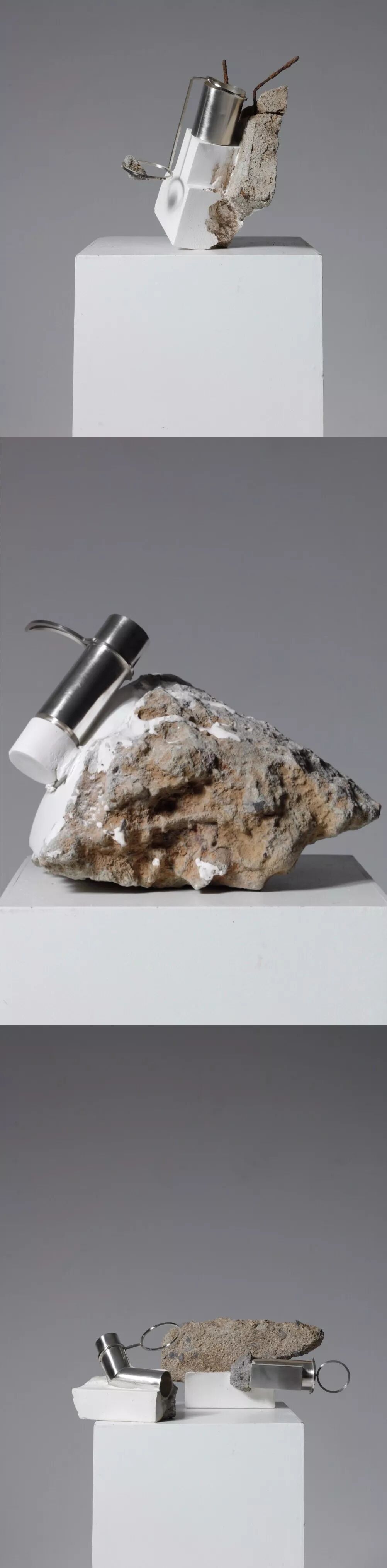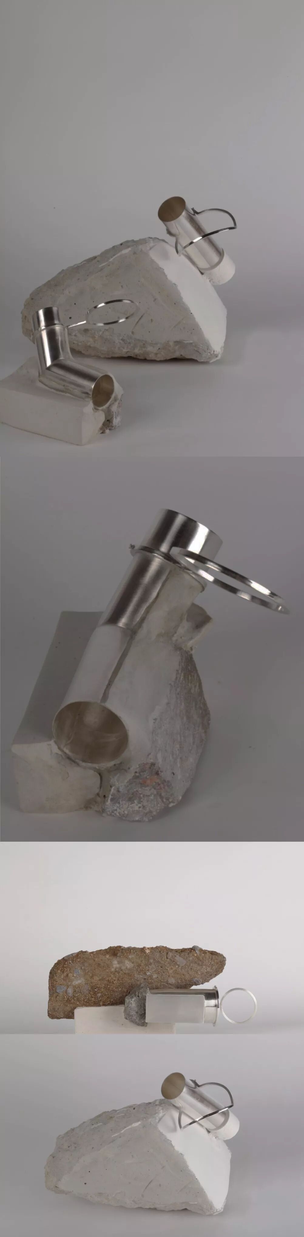 在材料选择上,除了使用金属银之外,还使用了水泥、钢筋、石膏等建筑材料。粗糙的水泥表面与抛光后的金属材质相对比,精细中平添了一丝粗犷意味。