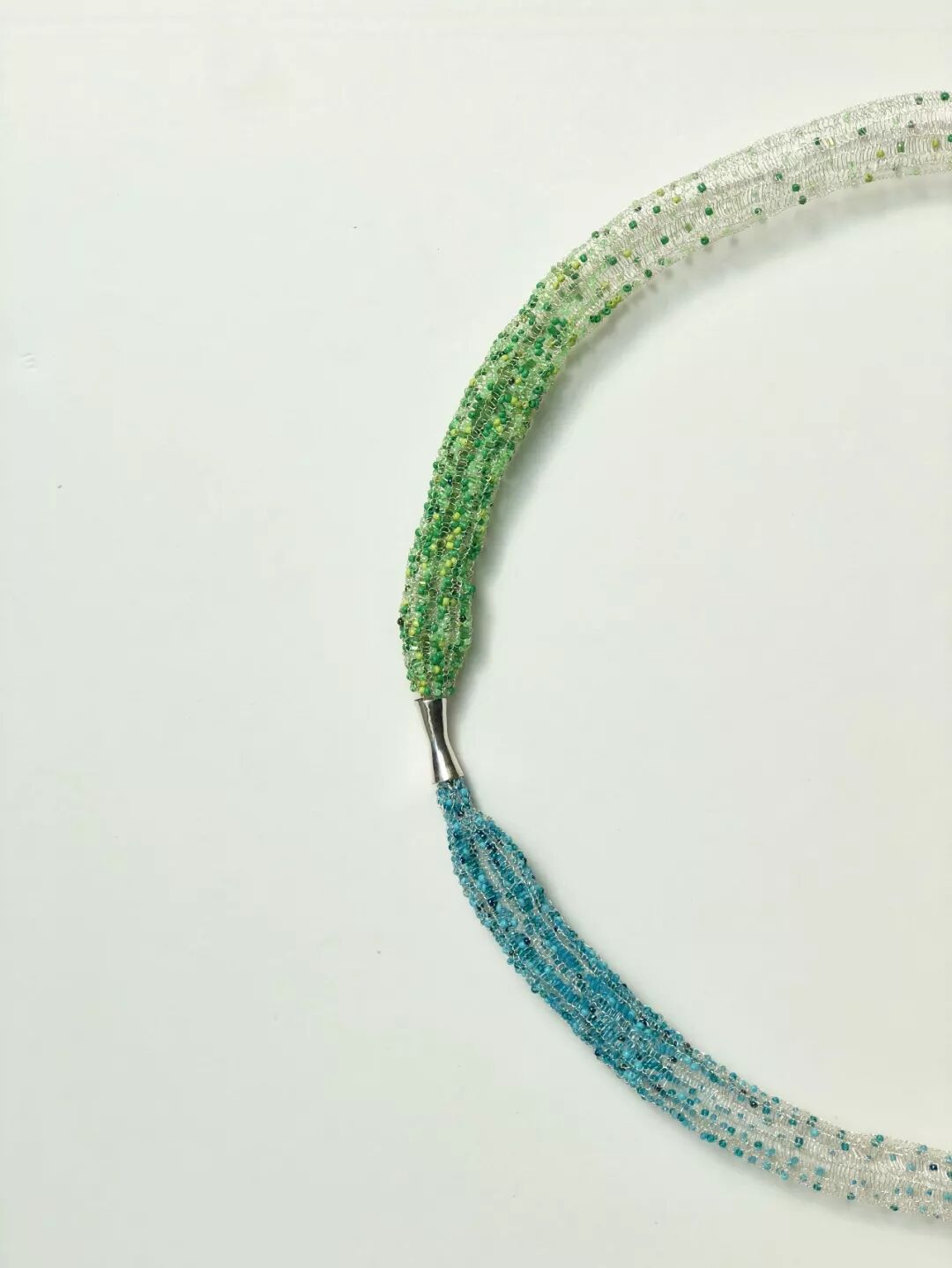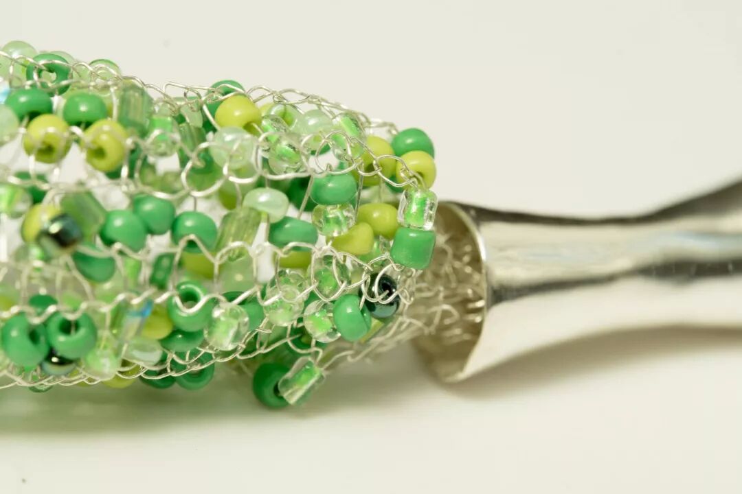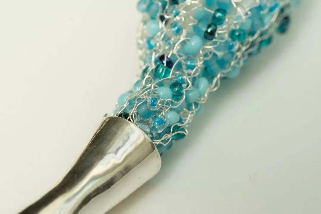 再在银丝中,穿入彩色的珠子,搭配不同的手法,从而去展现珠子在金属上的一种韵律。