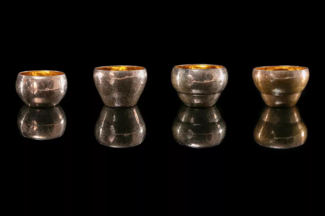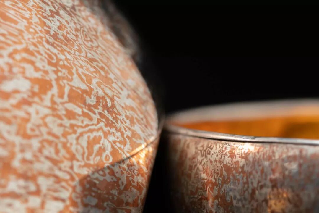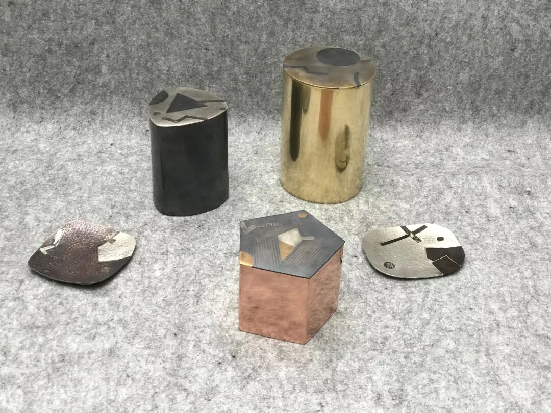 别看只有两个浅盘以及三个立体器皿,这组作品的制作工艺可以说十分繁琐复杂。并且用到的材料也很多种:纯银、紫铜、黄铜、木纹金、赤铜丝。