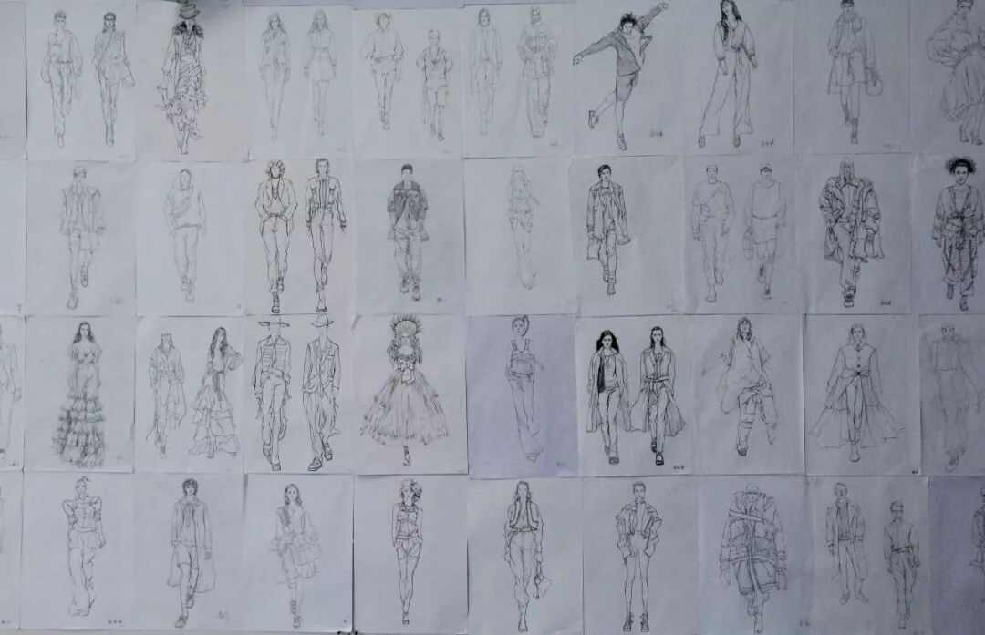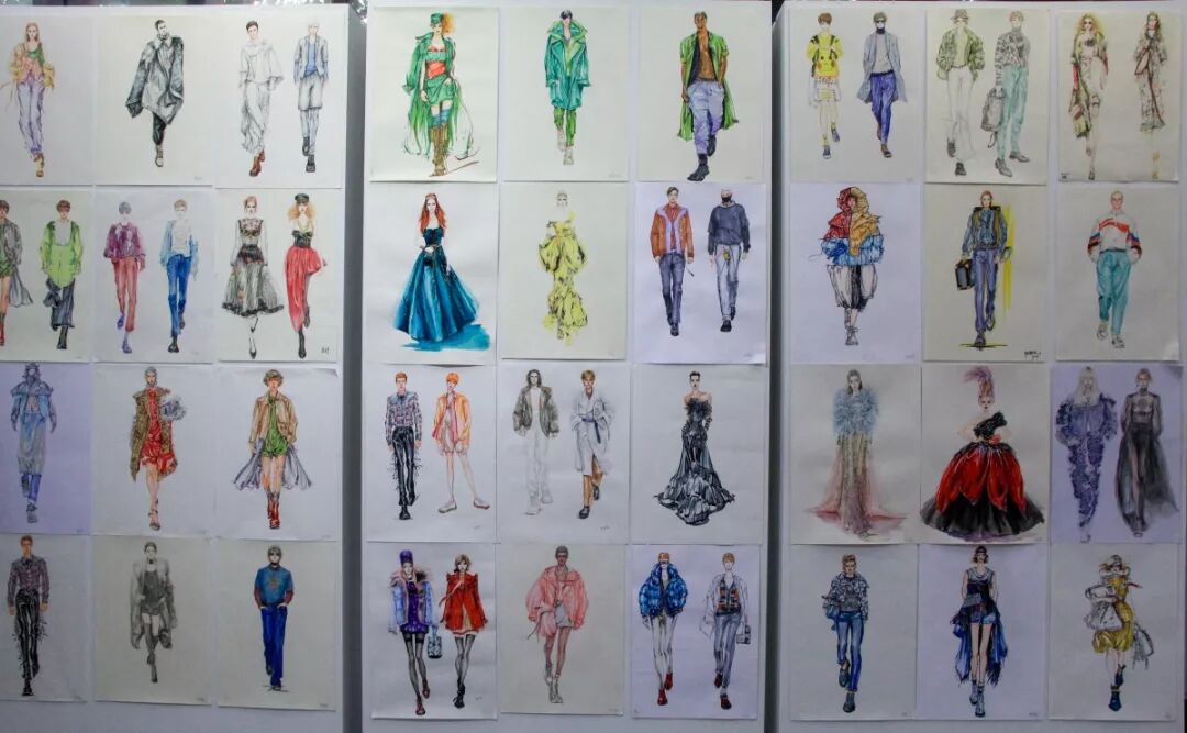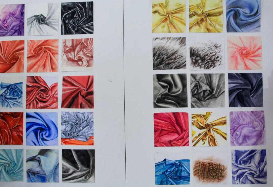 A:时装速写是以黑白线条表现的,参考一般都是秀场图。服装材质表现是用彩铅水彩马克笔等等来表现布料的质感,左边墙上一个个正方体格子里面的就是。服装表现技法是根据照片和自己之前学到的质感表现,综合运用到一起。最后一个课程是时装画,就是摆在中间的画。时装画追求的是效果能给人一种很惊艳的感觉,然后细节也会很精致。种类分为细节和整体,细节就是描绘脸部 ,一般都有精致的妆容或者配饰。整体就是整个人,一般动作或者人体会比较夸张,以达到张力的效果。