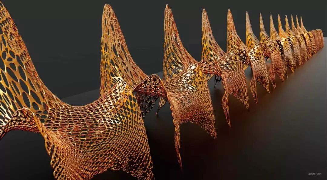 参数化设计以算法编程为基础、通过相关设计要素的数据化,在计算机中设定相应的逻辑或规则从而生成系列成果,强化过程的逻辑性及结果的不确定性。这种设计方法具有研究与实验的价值,结合其他学科相关成果进行综合探索,突破以往学科知识系统的单一性和封闭性,让设计在更大的智库范畴进行探索。数学、物理学、生物学、力学、机械设计、计算机等学科的相关成果为参数化设计进行跨界研究提供了极其丰富的知识储备,更易突破常规形式与经验形态。理论上只要参数无穷,计算机就会相应的生成无限数量的“族”形。