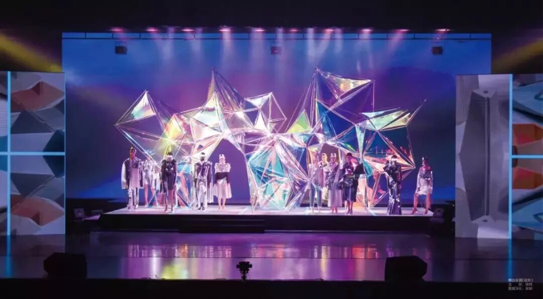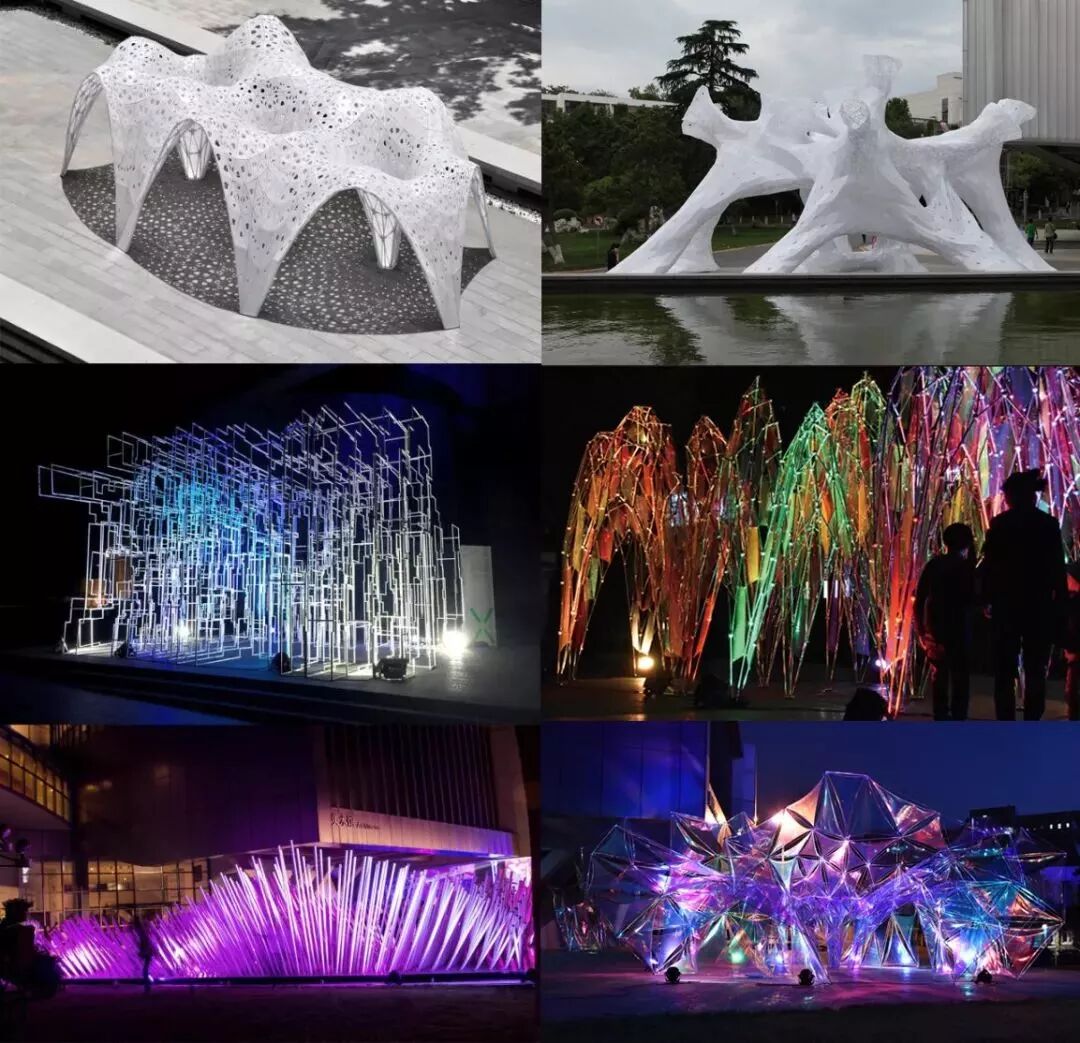 2017年则是“复杂曲面细分下的材料表现”,学生使用拓扑构形的方式,对花朵整个绽放过程进行数字模拟,最后演变出富有动态视觉和流动曲线特征的抽象形态,材料实验后选用了镭射膜作为建构表现的物化主体。2018年以“随机散点生形网格下的最小曲面形态表现”为研究课题,将作品形态用计算机生成后进行曲面网格的二次细分,每个细分网格内嵌入彩色膜,使其在阳光下各个时段产生不同的空间效果和情感体验。