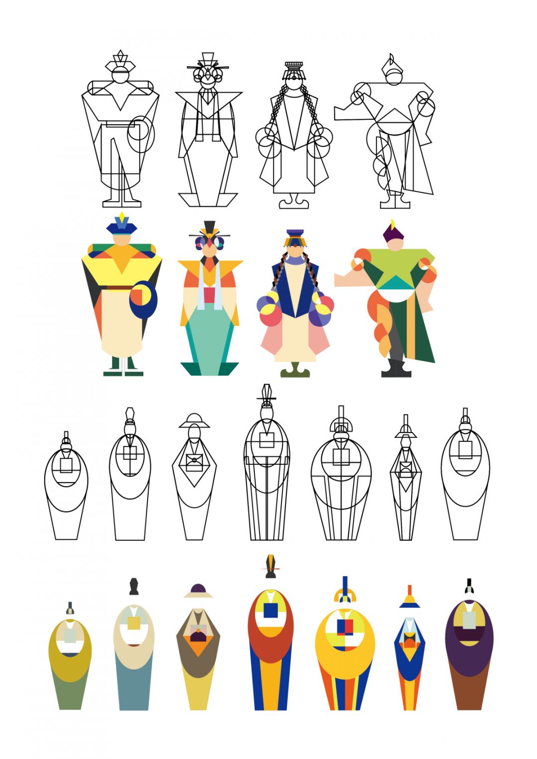 我们运用包豪斯舞台人体变形法则——去物质化、可走动的建筑,将人体结构几何化,呈现出简单又不失角色性格的独特造型。