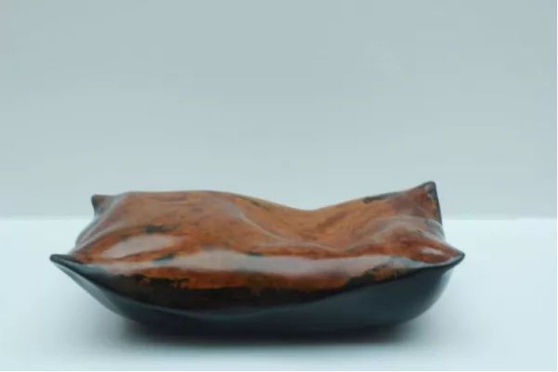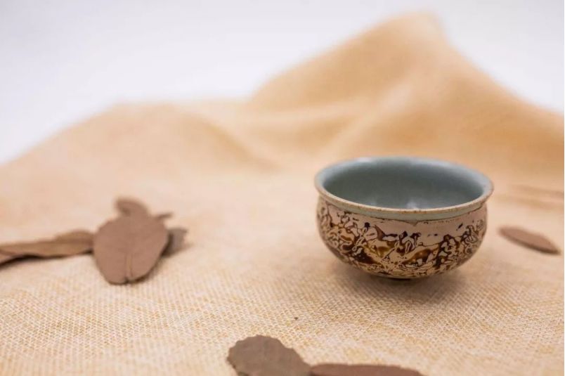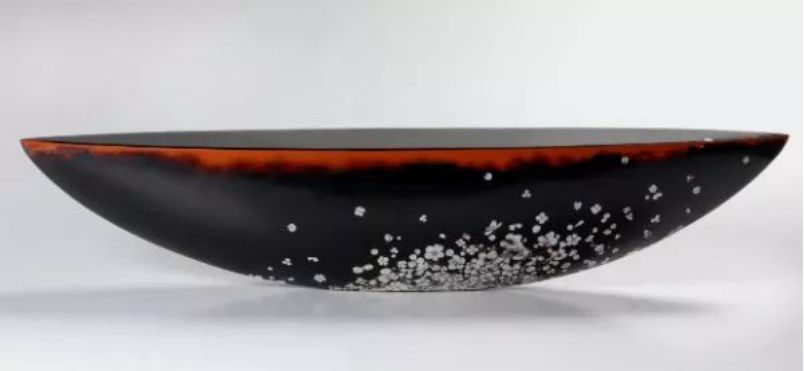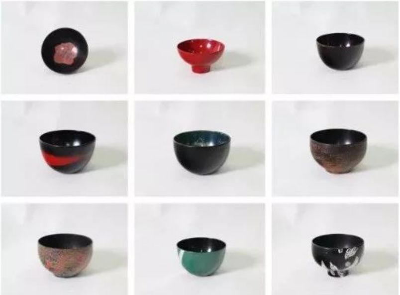以木胎漆碗为载体,加以各种漆艺技法修饰,漆粉,素髹[xiū,把漆涂在器物上]红,透红等。