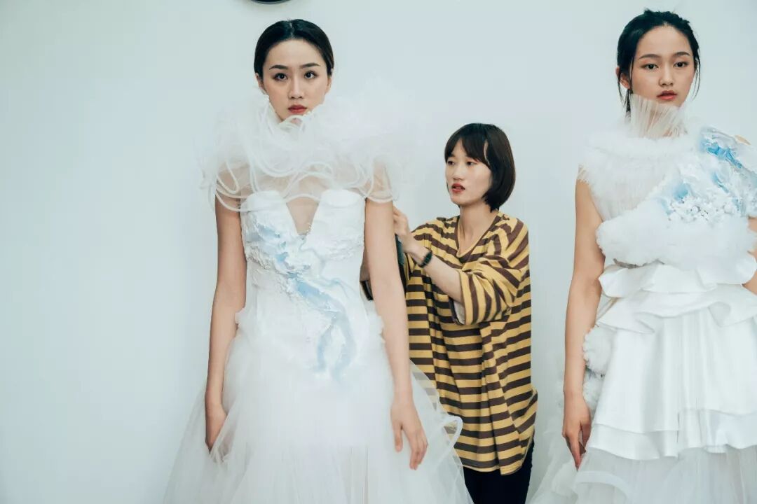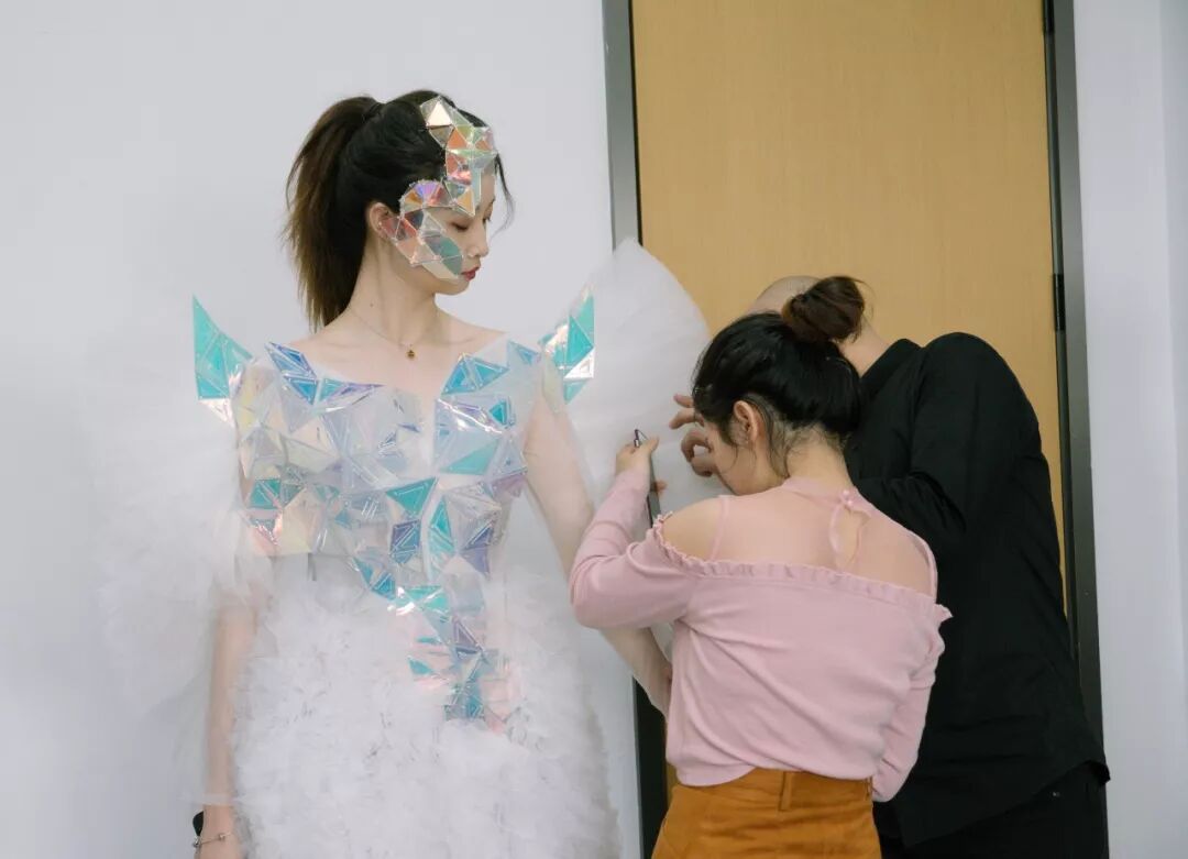 5月1日,服装秀进行最后一次试装,服娃们根据模特上身效果再做最后的微调改动。