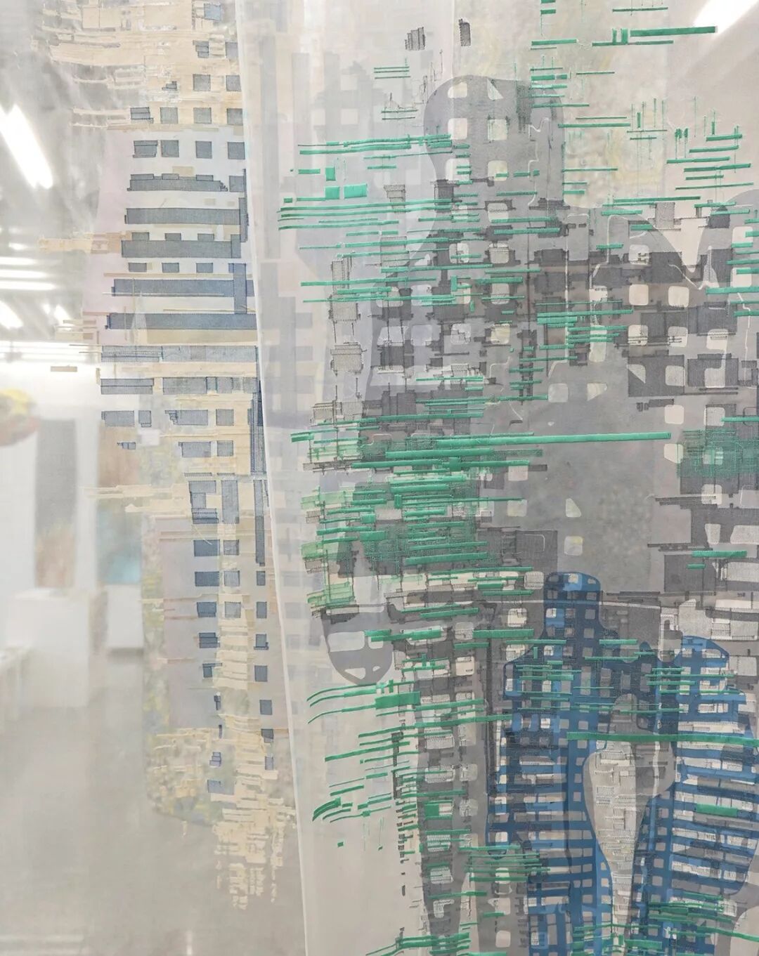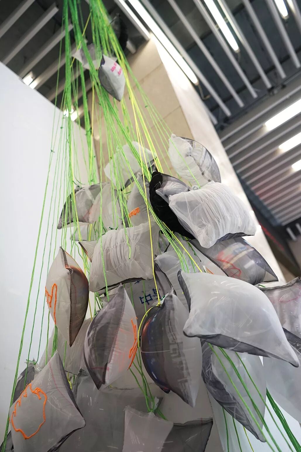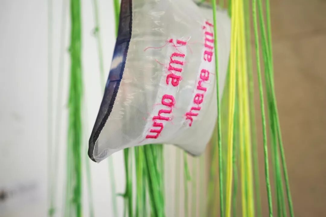 作品由一个个记录了作者走过的路的标志的充气口袋和绿色的线构成。作者用绿线将每一个口袋串起来,就像是电影中常见的定格画面,纪实摄影。很多事物只会在特定的时间段出现,一瞬间之后就逐渐淡出人们的记忆。人们可以遗忘,但是不能否定它们的存在事实,就像一个人的过去,以及他所看到的事物。