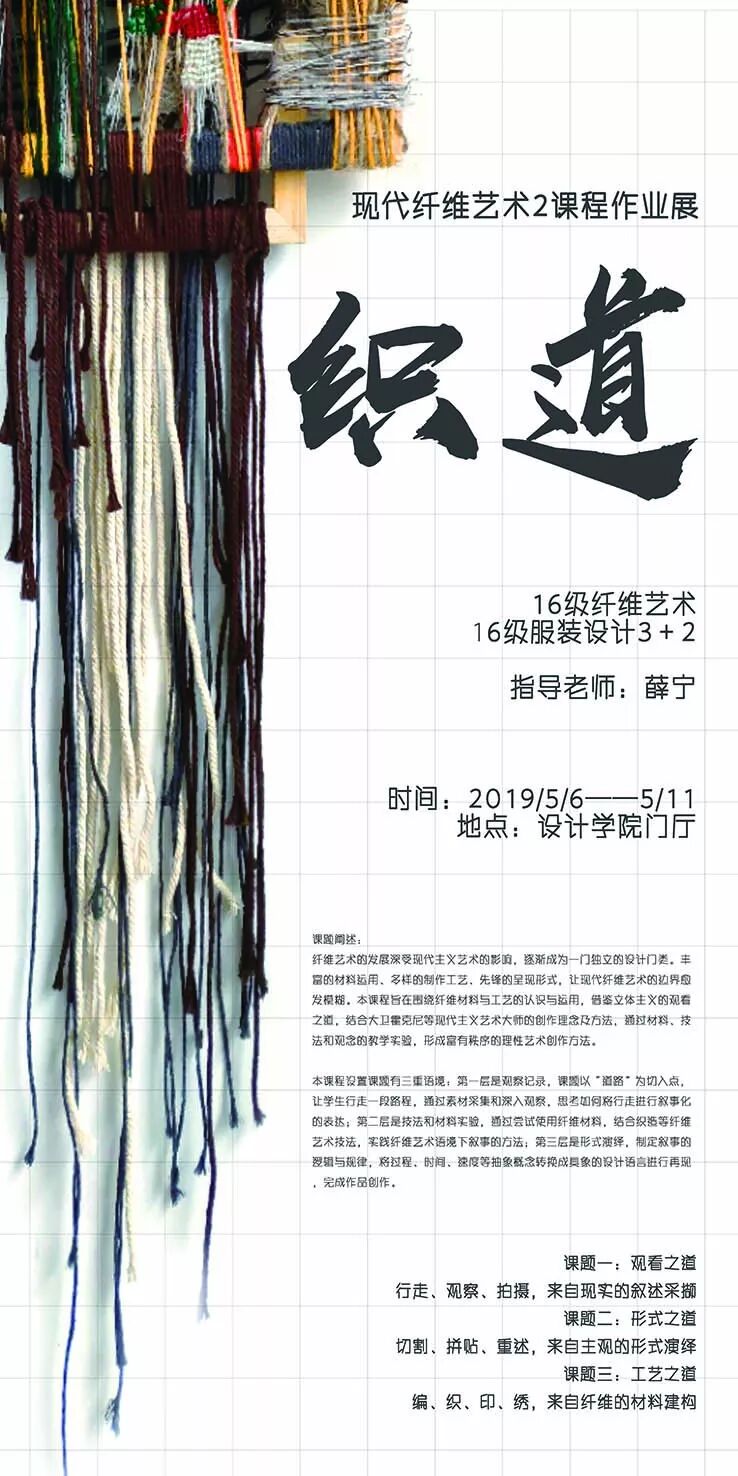 该课程设置课题有三重语境:第一层是观察记录,课题以“道路”为切入点,让学生行走一段路程,通过素材采集和深入观察,思考如何将行走进行叙事化的表达;第二层是技法和材料实验,通过尝试使用纤维材料,结合织造等纤维艺术技法,实践纤维艺术语境下叙事的方法;第三层是形式演绎,制定叙事的逻辑与规律,将过程、时间、速度等抽象概念转换成具象的设计语言进行再现,完成作品创作。