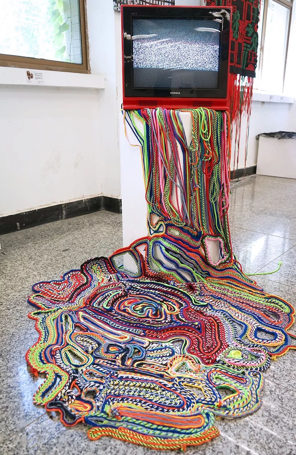 作品以“Glitch/故障艺术”为创作核心,模拟屏幕故障所产生的图像失真,溢出,逐渐脱离电视屏幕,占领整个空间。作品的主体颜色提取自颜色失真/图像异常/调休状态的电视屏幕。作品的形态具象,是两种故障元素的结合体,但是概念很抽象,需要观者好好体味,加以自己的感受和理解。