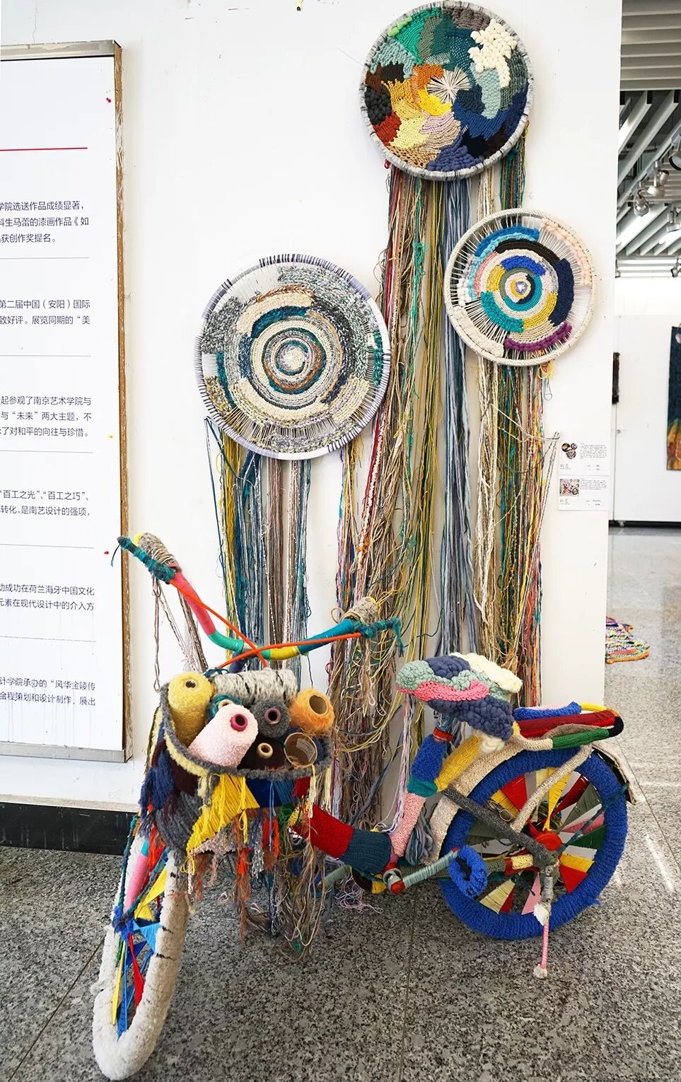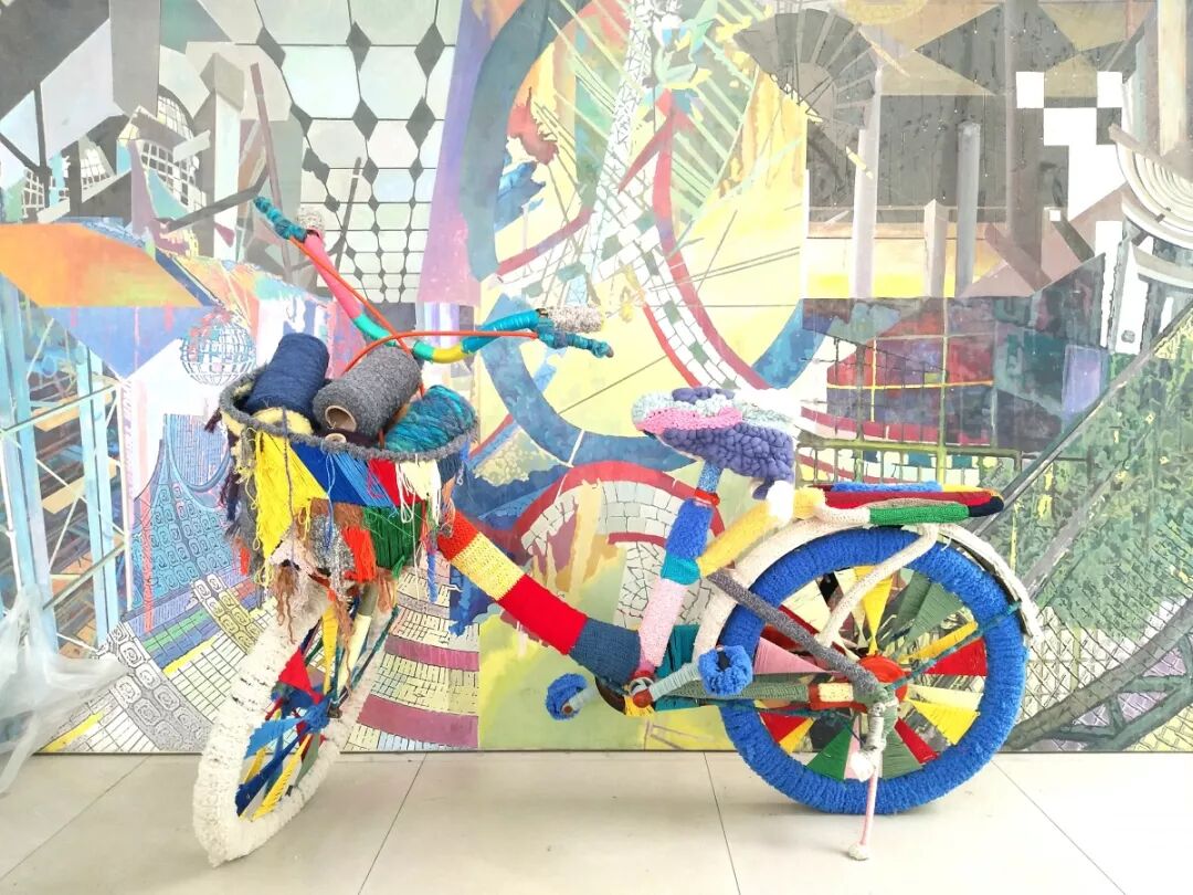 作者将在课程第一阶段中的所思所想通过作品呈现了出来。骑着单车,沿途经过的景物,色彩,都被变作素材融合进了一辆老式单车里。通过不同的纺织手法,将颜色不同的纤维材料编织到单车上,使这辆充满了年代感的单车焕发出了繁荣街巷的热闹感。