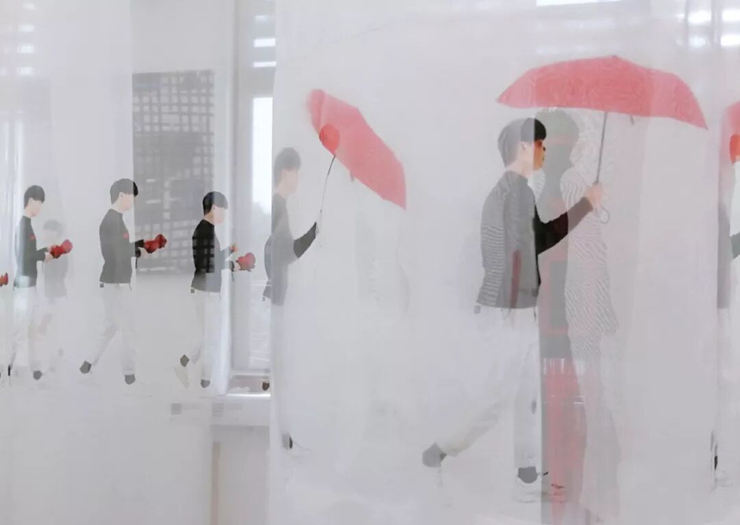 杜尚的《下楼梯的裸女》与作者产生了很大的共鸣。立足于每一个时间节点,通过不断重复同一个事物来表现时间的流逝,这一表现手法与作者不谋而合。于是,作者进行了大量的拍摄,通过人物走路,开伞,关伞的动态来传递下雨的信号,阐述从无雨到下雨再到雨停的过程。后期通过软件不断重复拼贴,最终呈现一个完整的作品。
