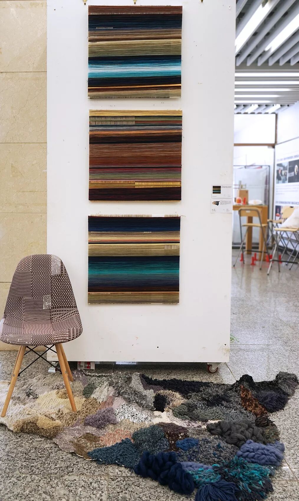 作品通过纤维的形式去探索如何通过材料的应用来表达情绪和时间概念。通过对行走动作的捕获,记录,加以变化,最终通过不同的肌理处理手法将它们展现出来。作品的整体色调取自南艺周边的大环境颜色,提升了作品视觉的整体性。